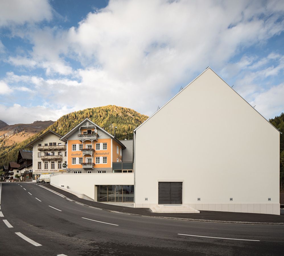 Um ihrem regen Vereins- und Kulturleben Raum zu geben, entschloss sich die Gemeinde Kals am Großglockner zum Neubau eines Veranstaltungszentrums, das durch eine Verbindung mit dem Gasthaus Ködnitzhof auch touristische Impulse setzen soll. Das neue Kulturhaus ist um ein Stockwerk niedriger als der Vorgängerbau, wodurch der benachbarte Bestand besser zur Geltung kommt: das spätgotische Widum und der Ködnitzhof, ein Beispiel solider alpiner Tourismusarchitektur der 1930er Jahre. Das steile Satteldach des Neubaus sowie dessen präzise gesetzte Tür- und Fensteröffnungen nehmen Bezug auf das Widum, ohne sich ihm anzubiedern.